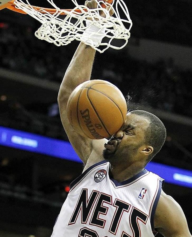 In der Welt des Sports gibt es auch Momente, in denen man nicht der Star sein möchte. Ein klassisches Beispiel: Ein Basketballspieler will den Ball blockieren und springt mit ausgestreckten Armen hoch. Genau in diesem Moment wird das Foto gemacht.